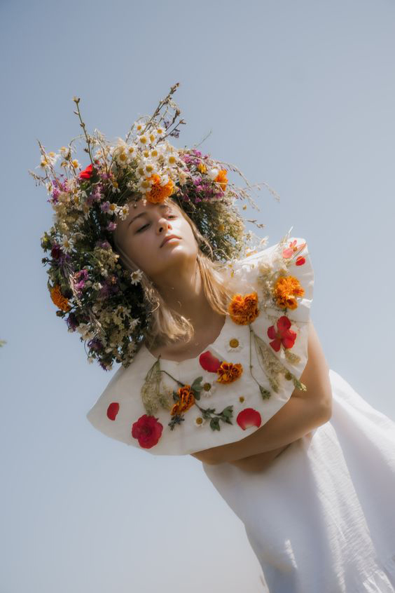 “Larger flower crowns often look better when hair is worn down, but it really depends on your personal style and face shape,” she says. “But braids and crowns are my absolute favorite combination. Crown braids, fishtail braids, side braids—they all look amazing when paired with flower crowns.”
