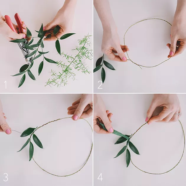 Step 4: Cover the florist wire with florist tape and wrap it around the first piece, leaving extra tape at the end to begin securing additional sprigs. Tip: The florist tape will stick together easily, so when you need a new piece, simply wrap it around the initial one.
