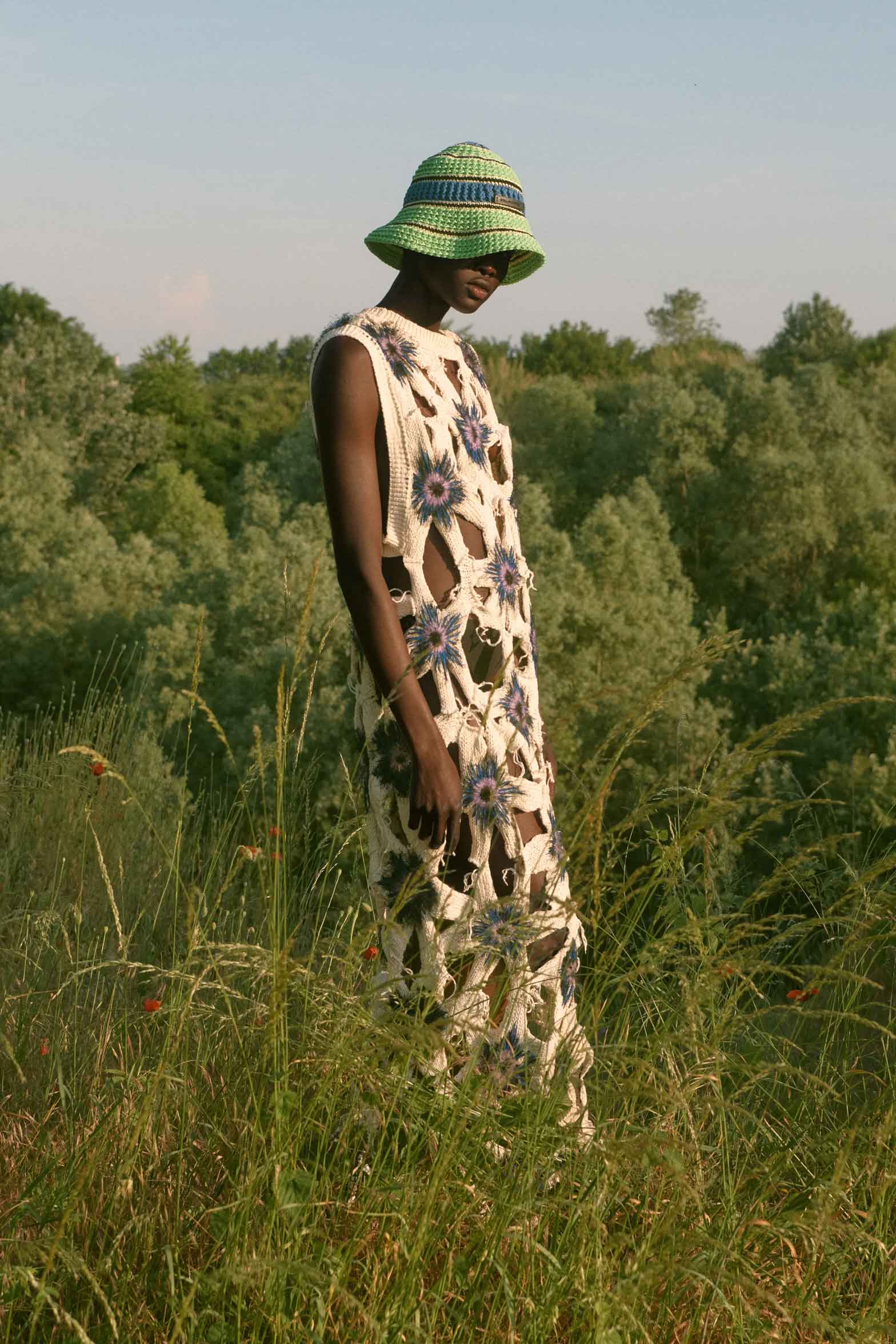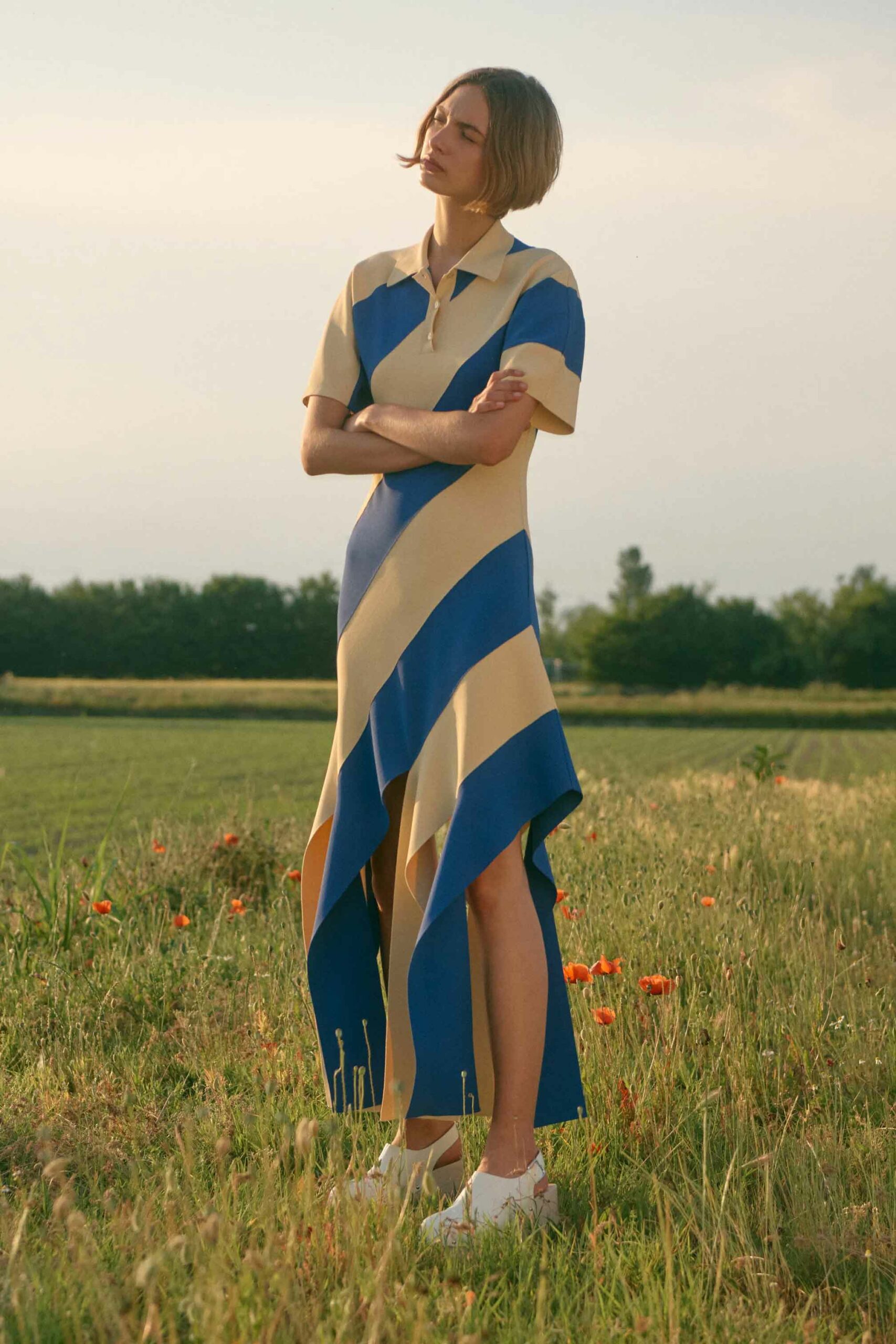 The designer’s natural-born optimism permeates this collection, which was shot in and around her eco factory in Novara, Italy. McCartney has reason to feel positive. She reported that 85% of the collection was produced sustainably, an in-house record. Among the developments here are bags and trainers made from grape leather, a material created from the grape waste produced in the wine-making process that is more readily available than the mycelium leather alternative she’s also championing.