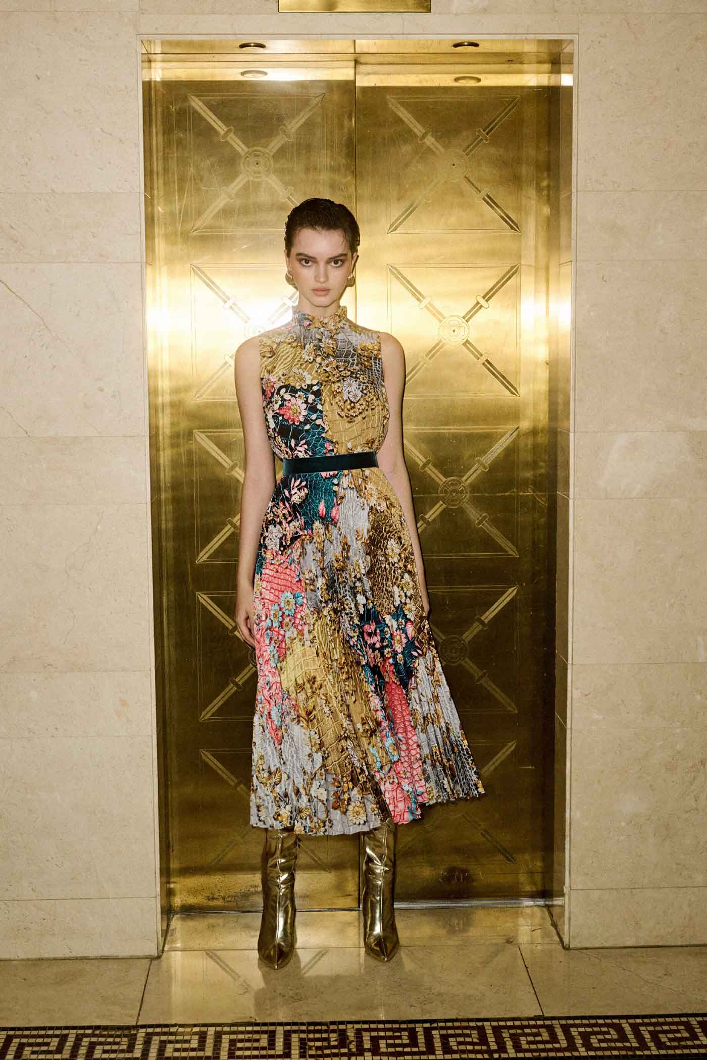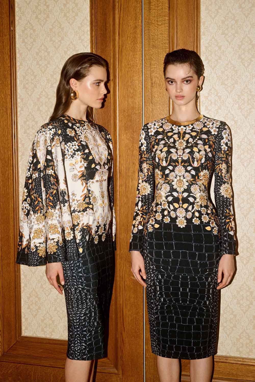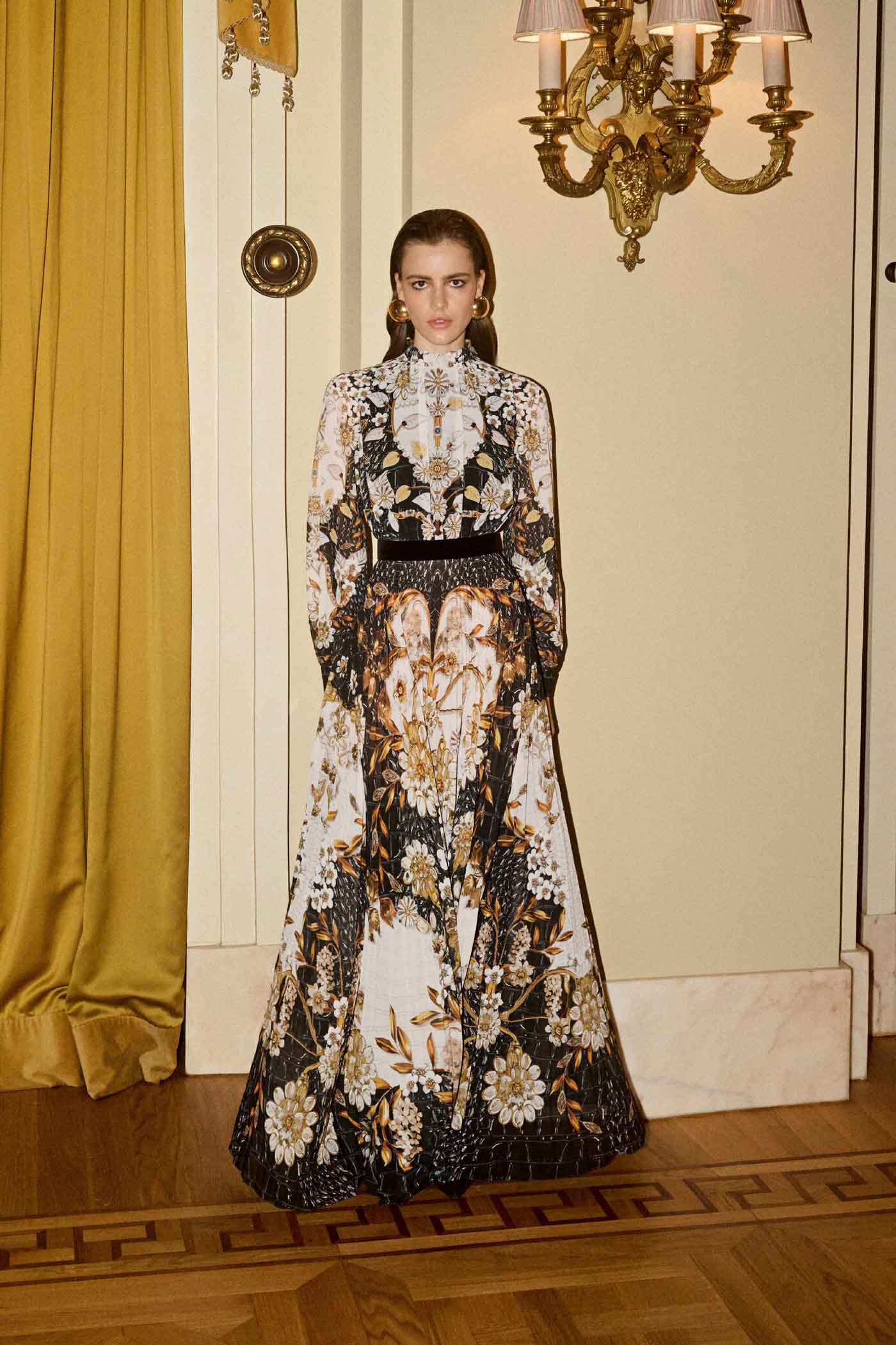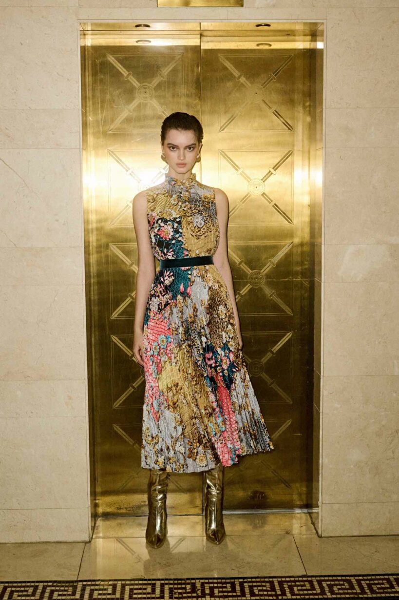 ‘Metallum Repeat’ transports fashion enthusiasts to the opulent ambiance of the 1950s, where gilded wall decorations adorned grand interiors with their lavish allure. This narrative pays homage to the richness of that era, with metallic accents, intricate patterns, and sumptuous textures that exude a sense of grandeur and luxury. Gold tones and shimmering details evoke the glamour of gilded surfaces, while structured silhouettes and tailored pieces echo the refined elegance of mid-century couture.