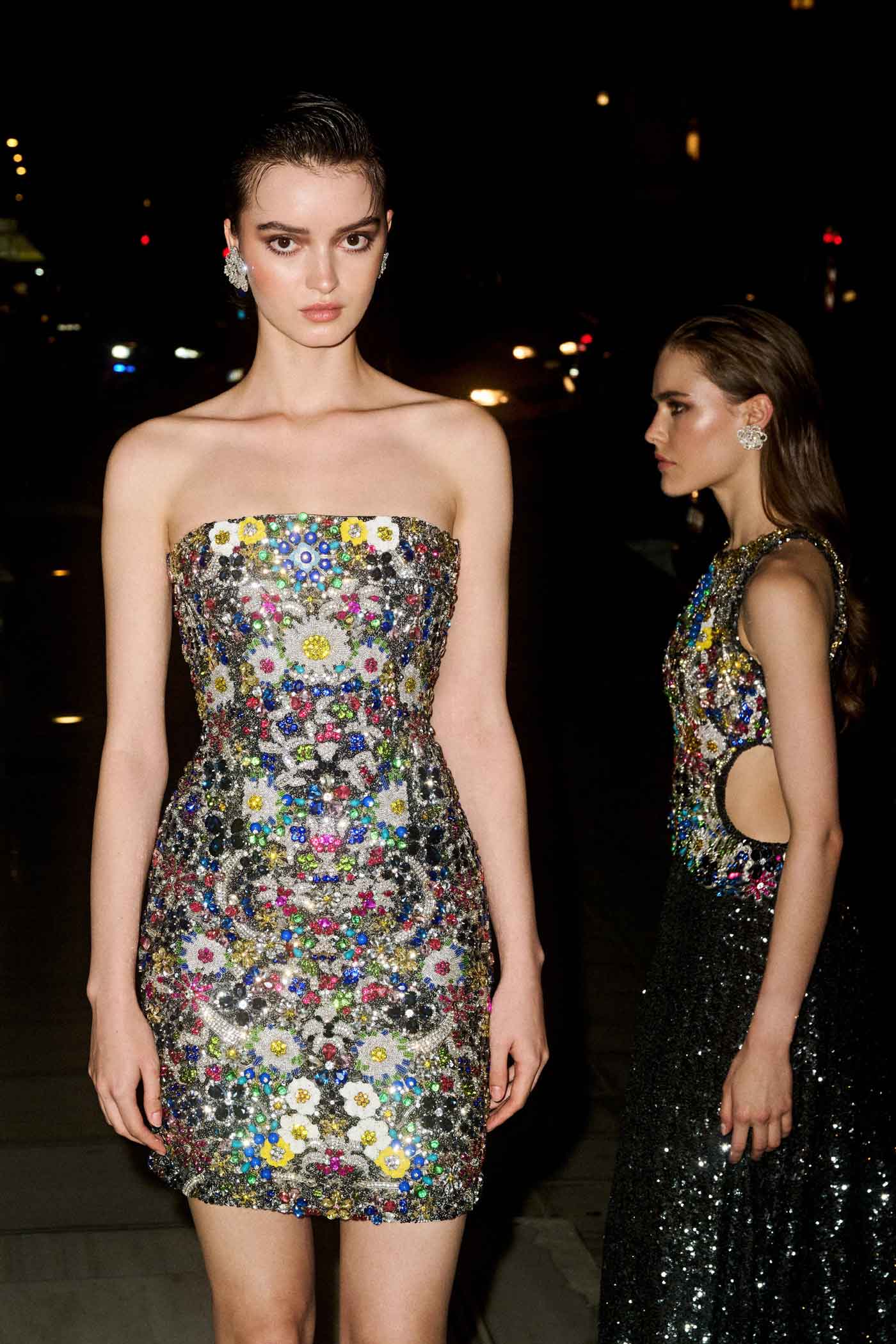 On the other hand, ‘Crystal Flora’ invites admirers into a world of enchanting beauty inspired by powder room trinket box jewels. Intricate floral motifs, delicate crystals, and intricate beadwork create a mesmerizing tapestry of textures and details. Each piece in this narrative is a work of art, capturing the ethereal essence of blooming flowers and the delicate allure of vintage jewelry. Soft pastel hues, sheer fabrics, and feminine silhouettes embody a sense of romance and enchantment, perfect for special occasions and soirées.