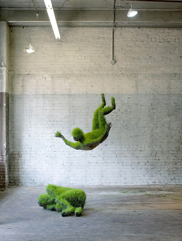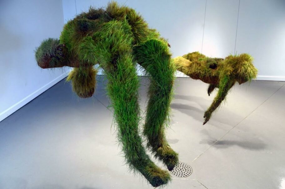 To create this work, Roussel used recycled materials (inc. metal) and fabric filled with soil and wheat grass seeds. The combination of man-made and earth-made materials is quite interesting I think as there is a crossover, a grey-area of what is in control of what. The grass grows out and overcomes the material and metal but these are what contains it and holds it together, or is it the artist who has complete control because she is the one who sculpted the man-made materials but the grass does it’s own thing.