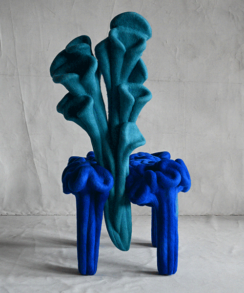 Lee’s work is functional (you can definitely sit on them), but he approaches each piece as sculpture. “I noticed that I could continuously build up volume on my textile pieces and wanted to find a way to translate that sculptural element to furniture. It took a lot of trial and error to figure out how to best use felted wool as a structural component in functional pieces.”