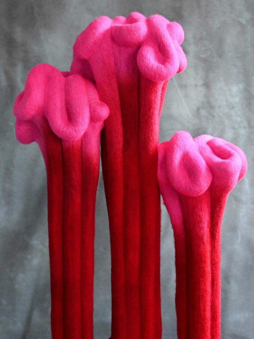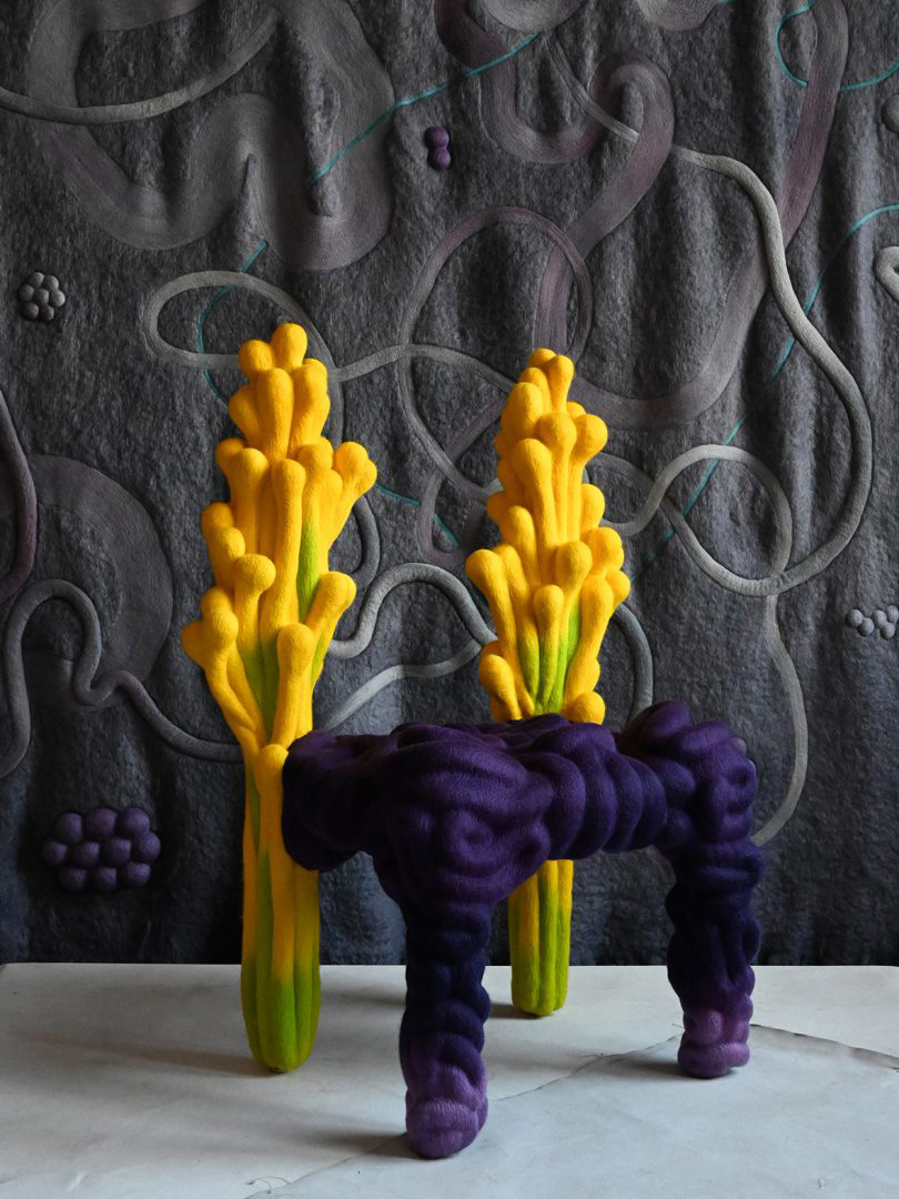Using merino wool, Lee’s process involves dyeing and then sculpting the wool with felting needles. An extremely labor intensive process, Lee’s furniture takes several months to complete. The felted wool is grafted onto a simple wooden frame. Because needle felting is an additive process, Lee will add more material to slowly sculpture the fibers as a his vision takes shape.