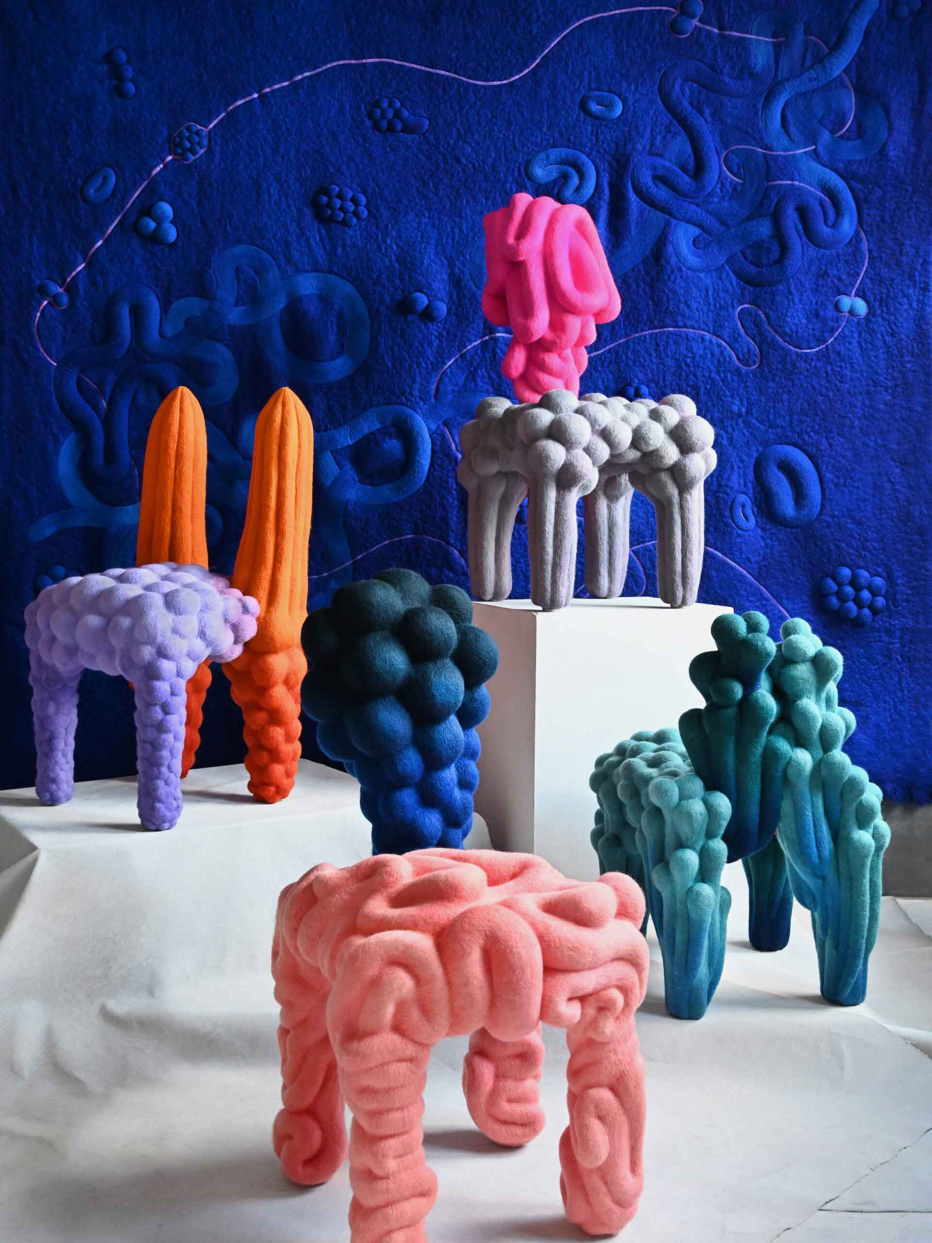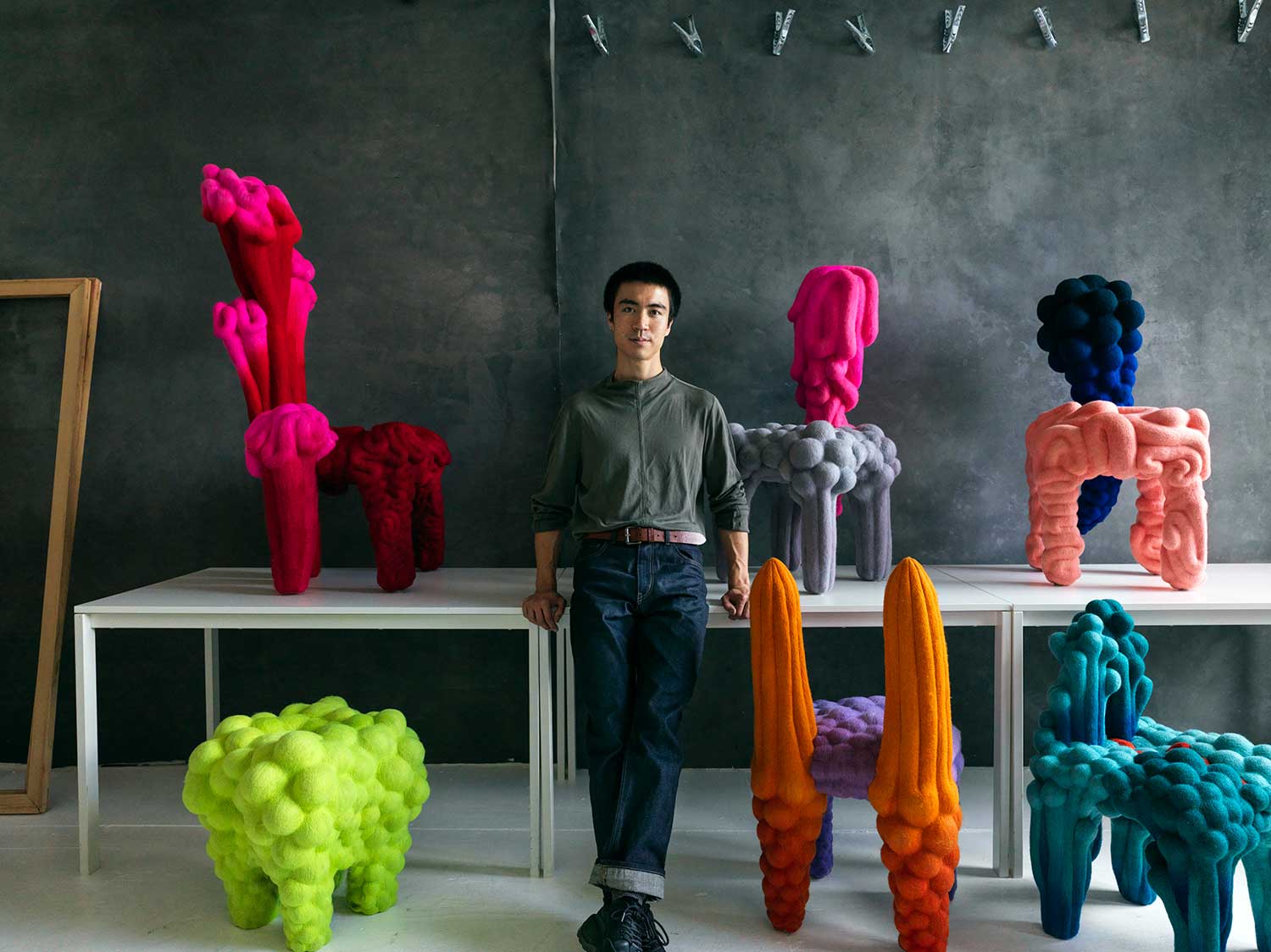 Lee, an artist and designer based in New York, studied English Literature at the University of Chicago and graduated in 2015. He began working with felted wool fiber in his textile work since 2018 and shortly after that, began selling them through the Noguchi Museum shop. It started as a side project from work he had picked up in set design for fashion photography, Lee tells us, “When the pandemic hit and the fashion industry shut down, I began experimenting with creating more 3-dimensional, sculptural forms. That eventually evolved into furniture. Wool is an incredibly seductive and malleable material in that it can be both supple and rigid, depending on the density of the felt.”