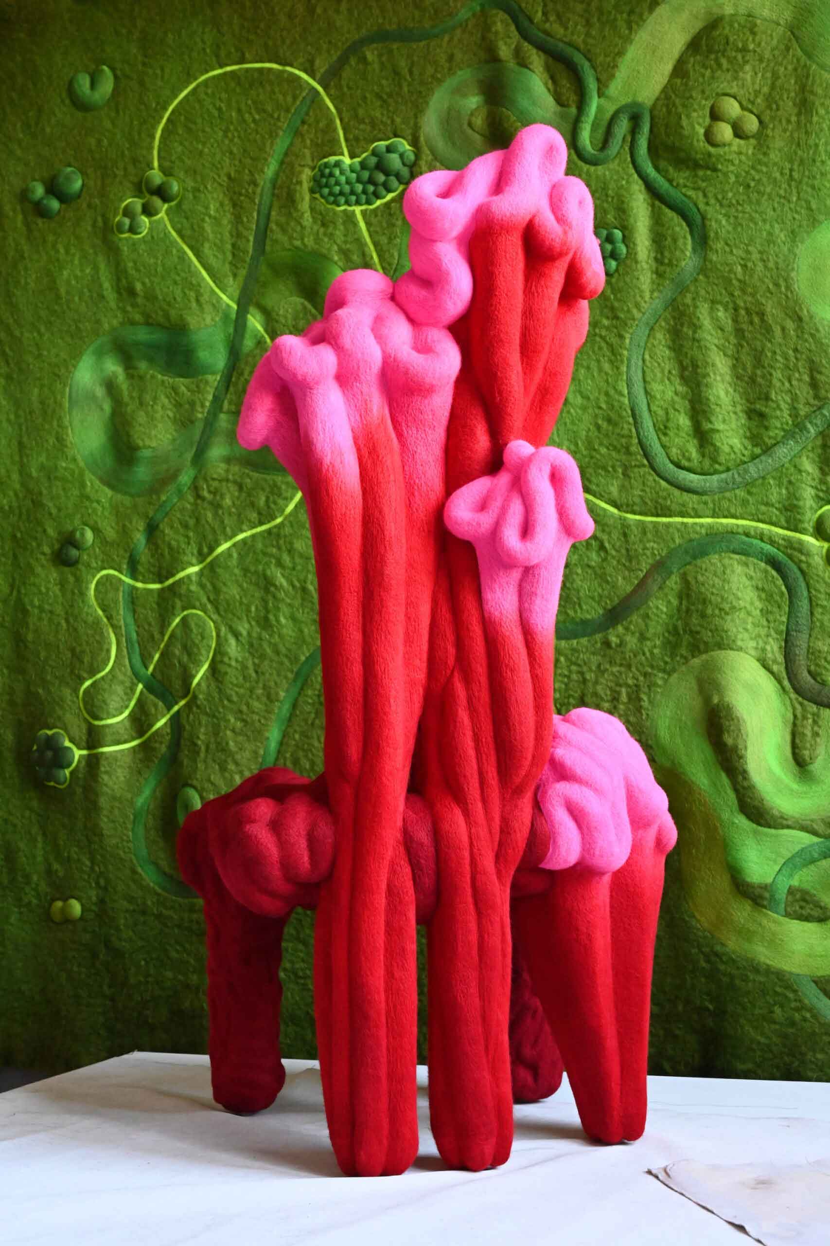 Using merino wool, Lee’s process involves dyeing and then sculpting the wool with felting needles. An extremely labor intensive process, Lee’s furniture takes several months to complete. The felted wool is grafted onto a simple wooden frame. Because needle felting is an additive process, Lee will add more material to slowly sculpture the fibers as a his vision takes shape.