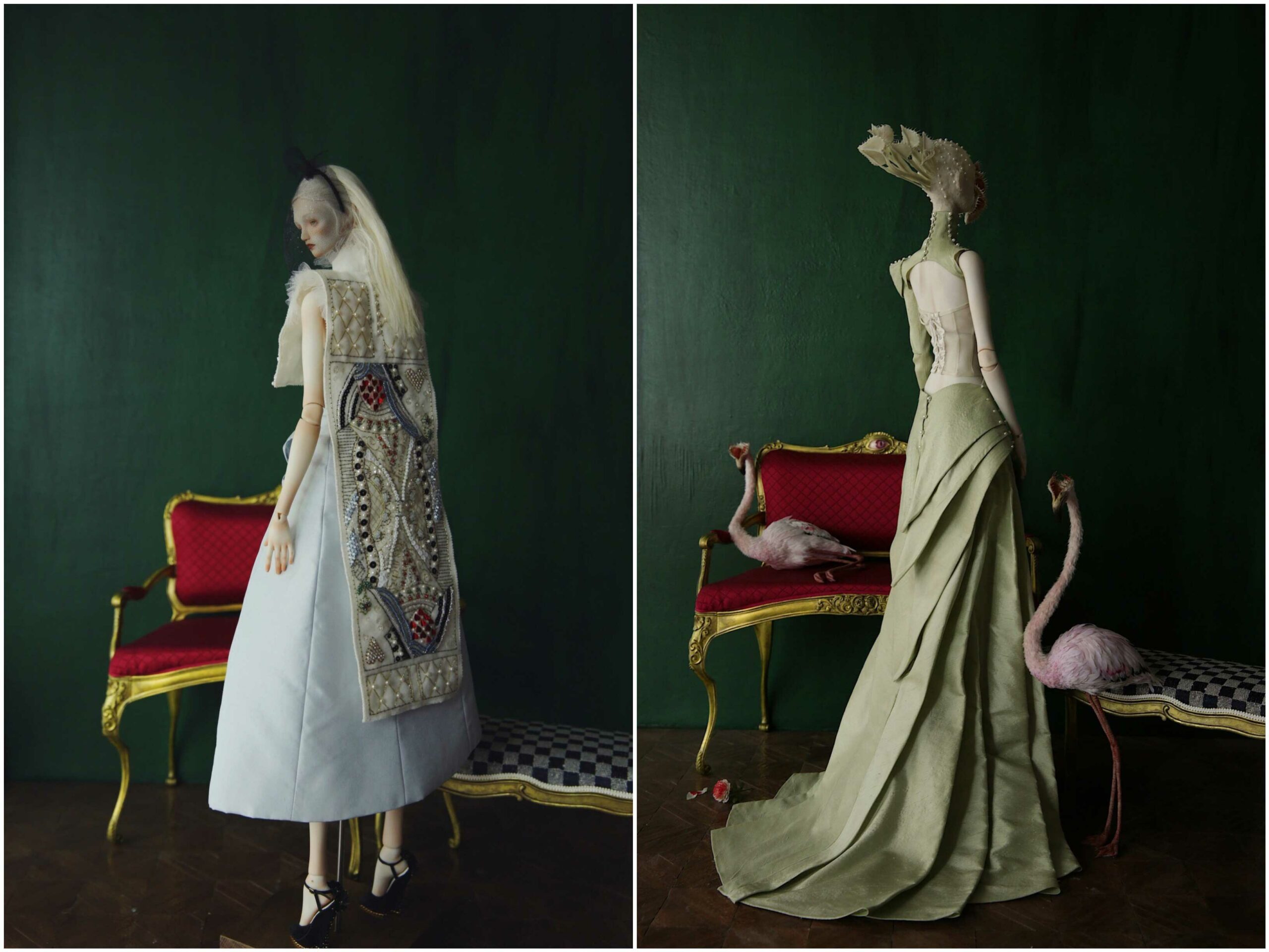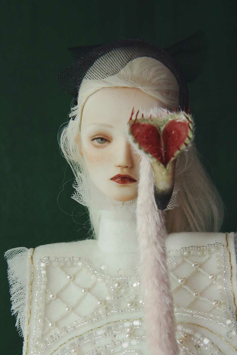 In late 2010, I was inspired by a picture of Venus flytrap. I thought I could make heart-shaped flytraps for a headless queen of hearts. Actually, I named my first porcelain doll ‘Venus’ not directly after the Goddess or the planet ‘Venus’, but after the Venus flytrap. Then in order to match the flytrap, I decided to make a green gown for the queen. Having seen so many RED ‘red queen’, I need to break the rules if I want to impress the audience.