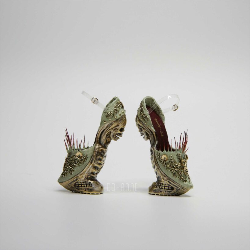 Actually, I don’t remember how and when this idea emerged. My target was to design shoes that no one had designed before. Then, in the long long process, it came to me suddenly. At the end of 2014, I started to build the 3D molds of the shoe soles, so the idea should come earlier than that. The rest of the shoes from the silhouettes to the details were designed based on the shapes of the soles. I kept improving the design til the end of 2017 and in March 2018, they finally became real. The soles were brass plated with 18K gold. It was my first time to try metal casting. I always like to try something new.
