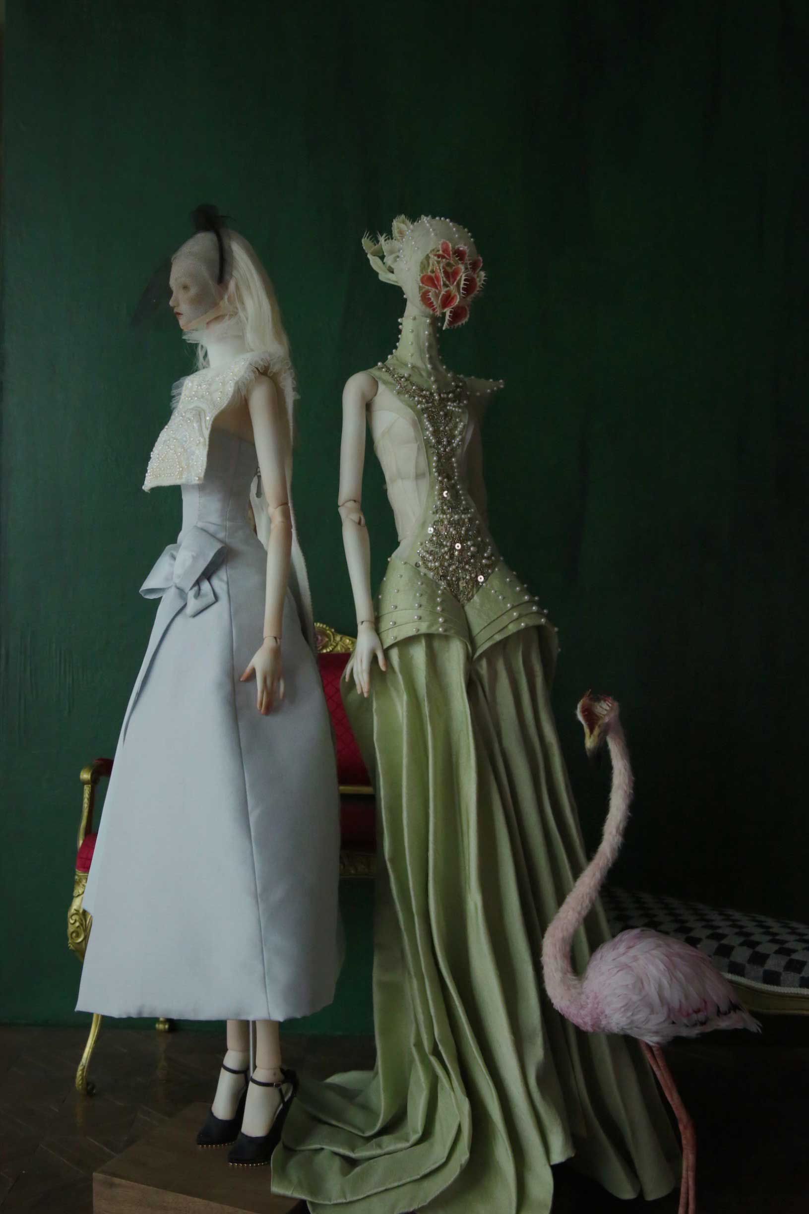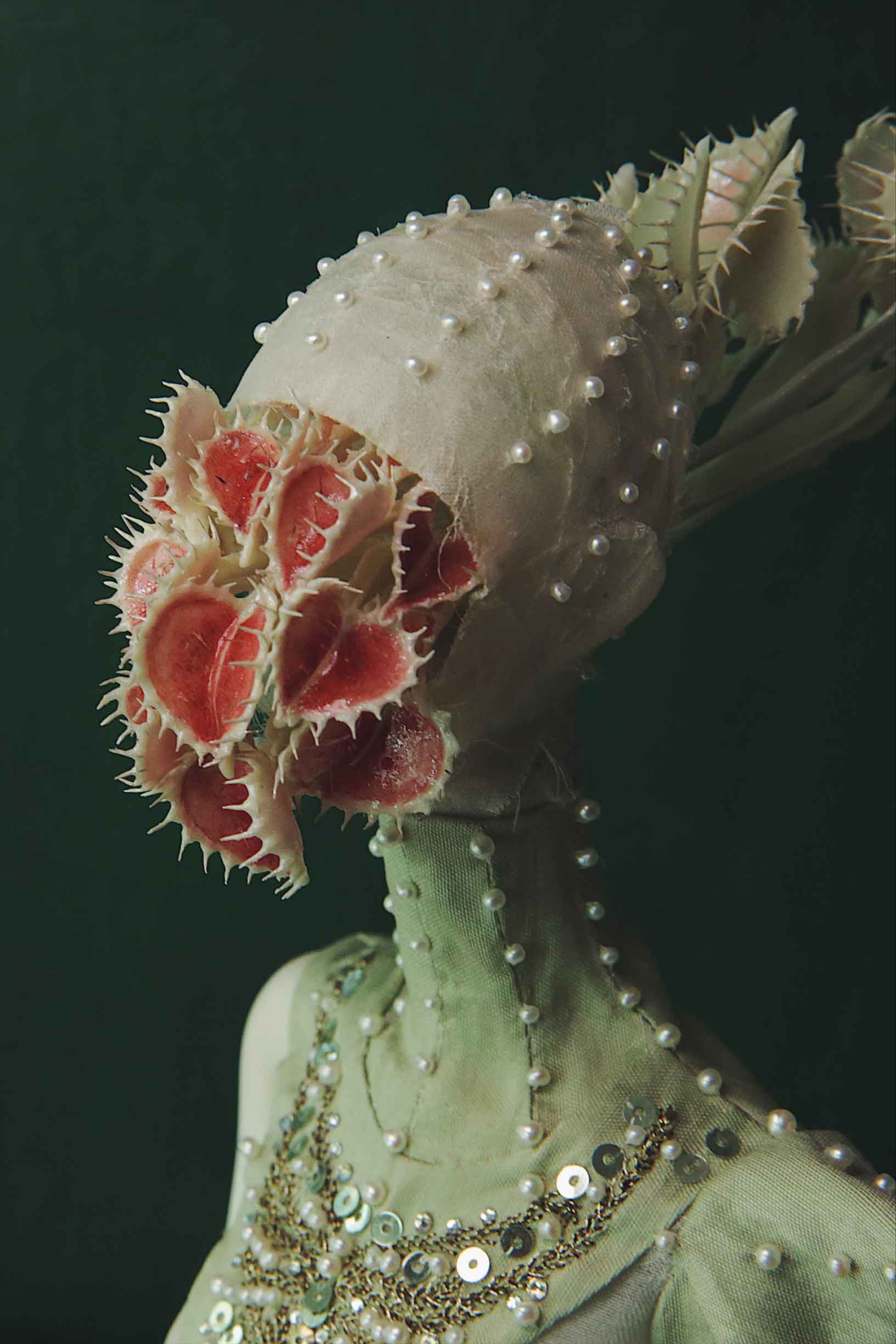 In late 2010, I was inspired by a picture of Venus flytrap. I thought I could make heart-shaped flytraps for a headless queen of hearts. Actually, I named my first porcelain doll ‘Venus’ not directly after the Goddess or the planet ‘Venus’, but after the Venus flytrap. Then in order to match the flytrap, I decided to make a green gown for the queen. Having seen so many RED ‘red queen’, I need to break the rules if I want to impress the audience.