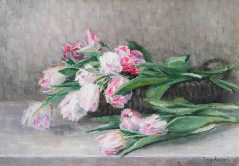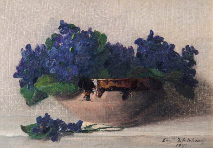 Bunches of tulips lying on a table, a bowl of delicate violets, a green glass vase bursting with colourful, loosely painted peonies. These are the subjects of just some of the paintings by local female artists in the collection at Leamington Spa Art Gallery & Museum and in the museum’s current exhibition ‘Outgrowing: Flowers and female artists, 1700 to Now’ (until 24th April 2022).