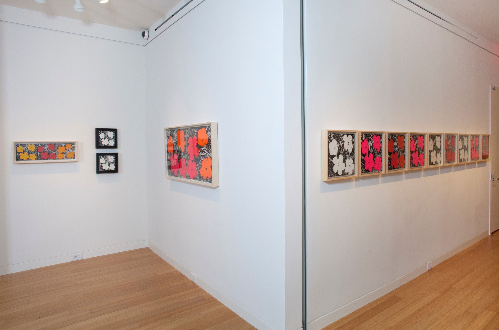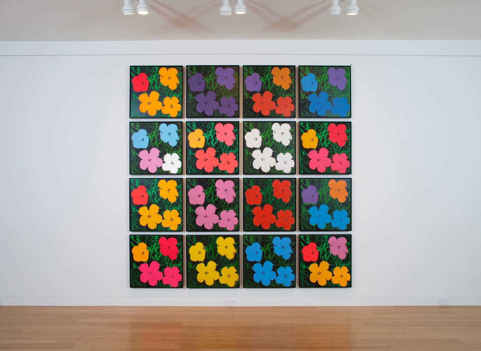 In the Flower prints, several blocks of color comprise the four flowers while a variant of gray outlines the bed of grass. The silkscreen process naturally lends itself to experimentation with respect to color and layering, and Warhol experimented with both, using different color schemes and painting the flowers a vibrant pink and orange in one print and all white in the next. In some of the prints, he deviates from the original template, creating shadows of multiple flowers through several silkscreen prints. Playful and inviting without being overbearing, Flowers was first exhibited in the Leo Castello gallery in New York in 1964.